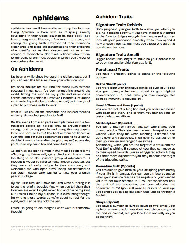 Aphidem is an independent product published under the DRAW STEEL Creator License and is not affiliated with MCDM Productions, LLC. DRAW STEEL © 2024 MCDM Productions, LLC.